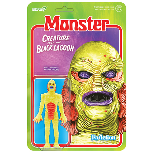 スーパー7のリアクションシリーズが持つ、そのレトロな雰囲気と相性抜群な1930年代を中心に銀幕を彩った名怪物たち「ユニバーサルモンスターズ」。立体化の機会も増え再注目を集めるユニバーサルモンスターズたちが3.75インチという手のひらサイズで再び!こちらは、その昔、人気の高いモンスターたちに扮したい子供たちに向けリリースされていたビンテージのハロウィン用コスチュームパッケージの奇抜なカラーリングからインスパイヤされ生み出されたギルマンのリアクションフィギュア。バックカードが「Monster」と表記されているのもまたたまりません!